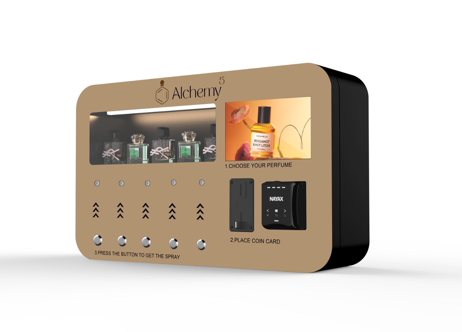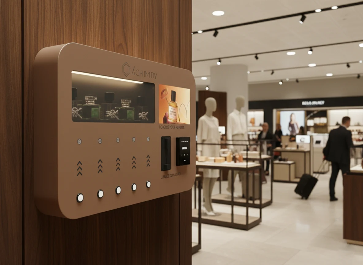 Specifically engineered for upscale venues like clubs, hotels, and malls, our modern dispensing kiosks offer users a curated selection of five premium scents through a sleek, champagne-gold interface.